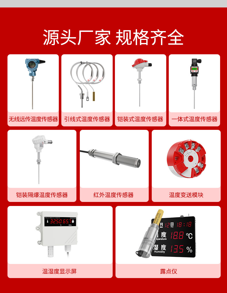 贴片式热电阻/热电偶全部采用的进口芯体,采用不锈钢外壳,从而达到稳定性好、精确度高、抗震性能强等特点。引线式热电阻温度传感器可以测量液体、蒸汽和气体介质以及固体表面温度,广泛应用于大棚、仓库、运输车、冷库、实验室、生产车间等环境的温度检测。